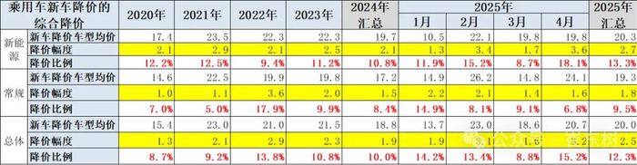 2025年1—4月份,总体乘用车市场新车降价车型的降价力度算术平均达到2.5万元,降价力度达到12.3%。4月份,总体乘用车市场新车降价车型的降价力度算术平均达到3.2万元,降价幅度达到15.2%。