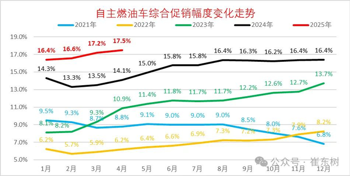 2025年4月自主燃油车的促销逐步达到17.5%的高位,较同期增加3.4个百分点。自主车企在2024年3-8月的促销上升较快,随后8-12月的促销总体稳定。由于自主的新能源促销小于燃油车,出口占比增大,因此总体促销相对稳定。