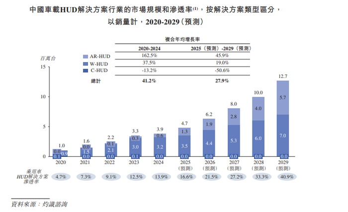 该市场中W-HUD解决方案预计将会逐渐往中低端车型渗透,成为智能汽车标配。W-HUD解决方案的销量预计由2024年的3.2百万台增加至2029年的7.0百万台,2025至2029年期间复合年均增长率为19.0%。
