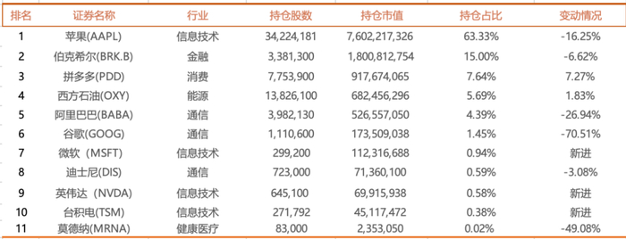 跟拼多多相对的是苹果,持仓量继续在减少。虽然苹果依然是H&H的第一大重仓,但今年一季度又减少16%,目前持仓股数为3422万股,市值76亿美元,占组合比重下降到63%。