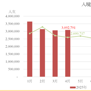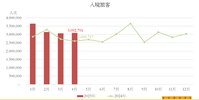 2025年首四个月的入境旅客共12,955,456人次,同比上升12.9%;不过夜旅客(7,578,976人次)及留宿旅客(5,376,480人次)分别增加23.4%及0.8%。首四个月旅客累计平均逗留时间较去年同期缩减0.1日至1.1日,不过夜旅客(0.2日)维持不变,而留宿旅客(2.3日)则增加0.1日。