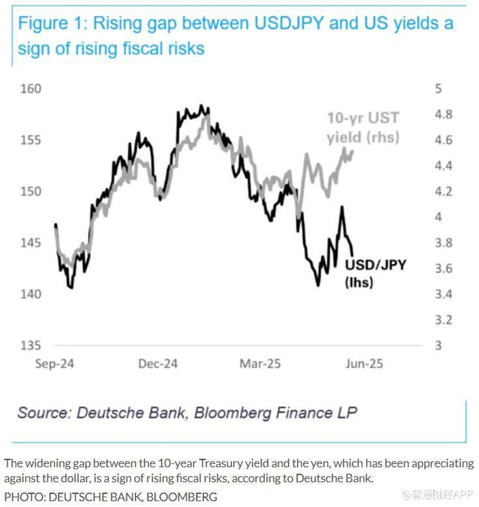 德意志银行驻法兰克福的研究员George Saravelos进一步提出,美国财政风险加剧的一个最具代表性的信号,是美债收益率与日元汇率之间的“脱钩”现象。他指出,尽管美债收益率不断走高,日元却持续升值,这可能意味着外国投资者正在逐步退出美国国债市场。