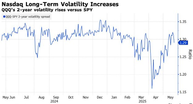 据野村证券的数据,这位期权买家分别花费3160万美元、1590万美元、8780万美元购入了亚马逊(AMZN.US)、赛富时(CRM.US)、Arm(ARM.US)股票的平价看涨期权。在这一轮的期权购买热潮中,追踪纳斯达克100指数的ETF(QQQ.US)的两年期期权的隐含波动率相对于标普 500 指数ETF(SPY.US)升至了自 1 月以来的最高水平。