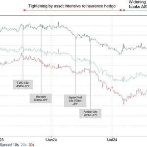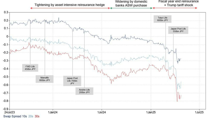 资产密集型再保险影响: 2023年10月之后,一系列大型的资产密集型再保险交易被宣布。在这种商业模式中,再保险公司接管日本寿险公司的资产和负债,并用更高收益的产品替代资产以赚取利差。在此过程中,日本国债常被出售,这对长期国债的供需平衡产生了负面影响。