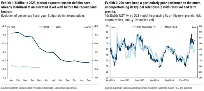 为未来提供反馈。上周五穆迪的信用评级下调、财政方案在美国国会的推进情况以及全球的溢出效应共同作用,进一步强化了人们对财政风险的密切关注。与 2023 年的经历相比,其相似之处包括对政策降息的信念逐渐减弱、财政问题的隐忧(因美国评级下调而加剧)以及来自日本的看跌情绪。然而,高盛认为此次美国国债面临的风险更多源于在全球对美国资产需求减弱的情况下,缺乏稳定整体财政轨迹的动力,而非对赤字规模或发行构成的突然担忧(这些在 2023 年发挥了更明显的作用)。