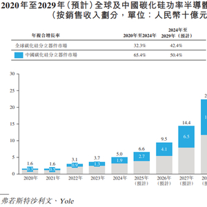 据基本半导体招股书披露,预计未来十年全球碳化硅分立器件市场将显著增长。2020年至2024年,该市场的年复合增长率预计为32.2%,销售收入从2020年的16亿元增长至2024年的50亿元。预计这种强劲增长势头将在接下来一段时间内持续,2024年至2029年,市场年复合增长率将达到42.4%,2029年销售收入将达到294亿元。