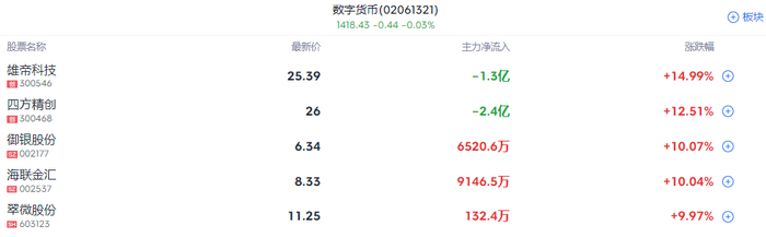 稳定币概念继续发酵,数字货币、移动支付方向领涨,海联金汇、翠微股份涨停,湘邮科技、中科金财、恒宝股份、拉卡拉等跟涨。
