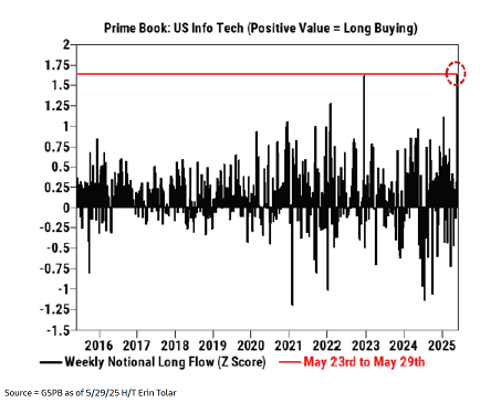 据高盛私人银行上周数据显示,美国股市连续第四周实现净买入(1年期+1.5 标准差),主要由多头买入推动,空头流动相对较弱。上周美国名义多头买入——以个股为主——为去年 11月以来最大(5 年内第 97 百分位),显示对冲基金对承担特定风险的兴趣增加……