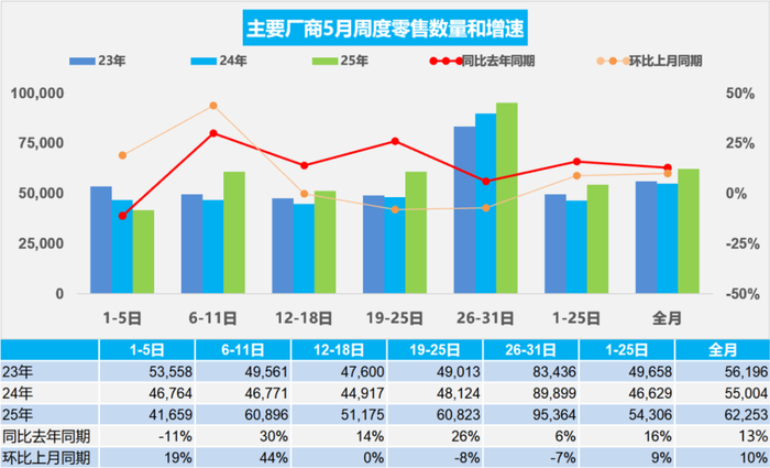 5月第四周全国乘用车市场日均零售6.1万辆,同比去年5月同期增长26%,较上月同期下降8%。