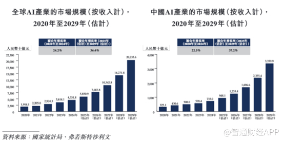 自大模型广泛落地以来,人工智能对产业格局的重塑正加速展开,其文本生成、语音交互、图像识别、智能控制等功能正快速赋能消费电子、汽车、工业等几乎所有领域,驱动生产效率和服务模式的深刻变革,AI应用也正从“可选”逐步演变为“标配”,产业发展速度远超预期。从市场规模层面看,中国AI产业规模从2020年的3251亿元显著扩张到2024年的7330亿元,实现22.5%的复合年增长率。虽然在早期阶段略微落后于全球增长速度,但在预测期内,中国市场将呈现快速增长,预计到2029年将达到33599亿元,从2025年到2029年的复合年增长率为37.2%。