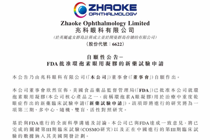 6月4日,兆科眼科发布公告,美国FDA已批准公司就环孢素眼用凝胶(公司核心产品之一,前称环孢素A眼凝胶)用于治疗中重度干眼症作出的新药临床试验申请。该项即将进行的研究将为一项第三期、多中心、随机、双盲、活性对照研究。