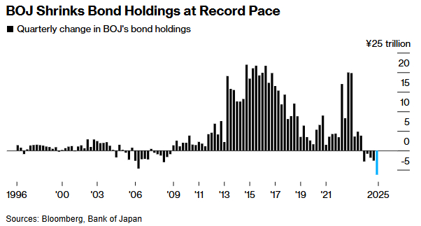 自去年8月以来,日本央行每季度减少4000亿日元购债。按此计划,到2026年第一季度,月度购债规模将较QT启动前的约6万亿日元缩减近半。据知情人士本月透露,6月会议的关键焦点是明年3月之后的缩减节奏,央行官员可能考虑将放缓幅度降至此前速度的一半,即每季度减少2000亿日元购债。