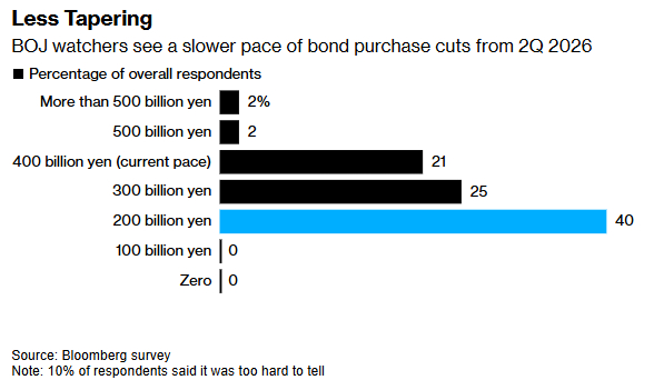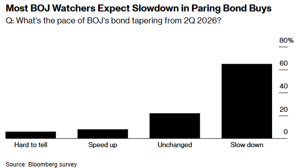 法国巴黎银行首席日本经济学家Ryutaro Kono指出:“债市不稳定不利于货币政策实施。为审慎确定缩表的合适节奏,日本央行可能从明年春季起放缓购债缩减步伐。”彭博调查显示,约40%的分析师预计新的缩减幅度为2000亿日元,四分之一认为是3000亿日元,另有五分之一预测维持4000亿日元的节奏。