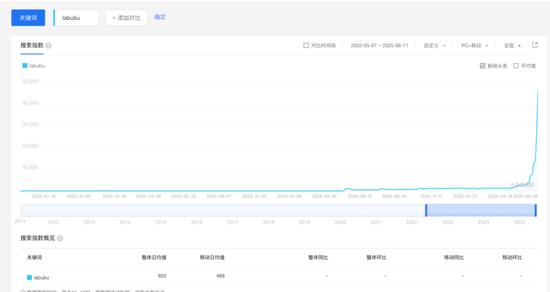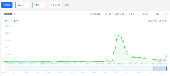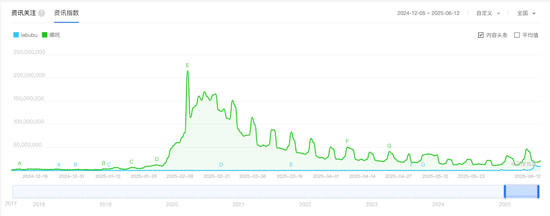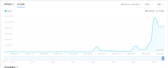 从搜索指数看,在2025年6月初之前,大家是没有兴趣去了解Labubu的,搜索指数一直不温不火。