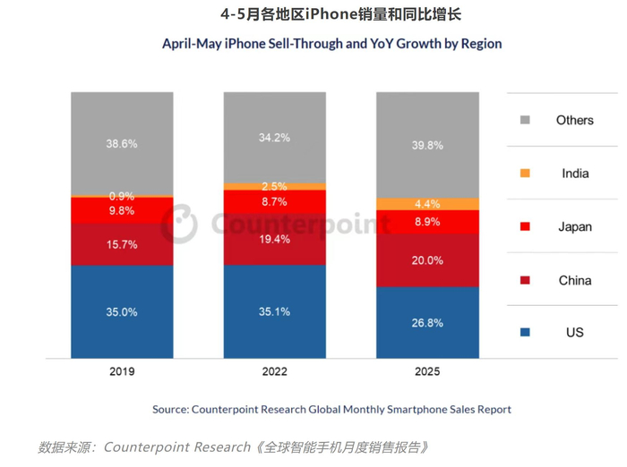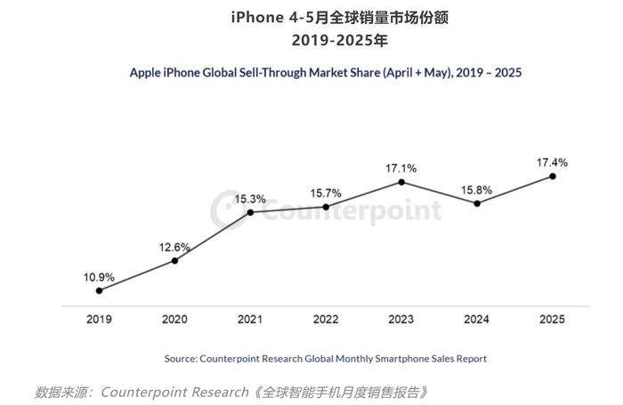 根据Counterpoint Research最新《全球智能手机月度销售报告》的初步数据,iPhone在2025年4-5月的全球销量同比增长15%,也创下后疫情时代以来该时期市场占有率的最高纪录。美国与中国作为Apple的两大关键市场,是该时期最主要的市场增长动力,终结过去三年在此销售淡季的下滑趋势,首次实现同比正增长。