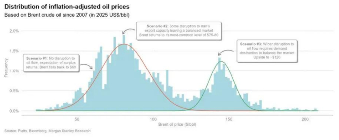 展望未来,上周五的事件大幅拓宽了未来油价走势的可能范围。不过,大摩认为这些走势可归为三种主要情景。这些情景共同为未来数周和数月应对石油市场提供了一个框架 。图表 5:大摩认为油价存在三种大致情景;以下呈现它们如何契合油价的历史分布 。