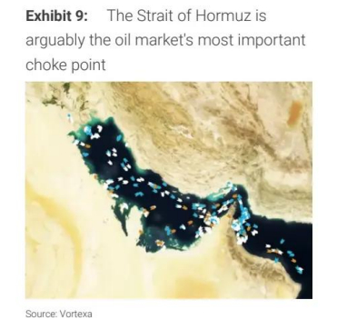 总体而言,中东海湾地区出口约 2200 万桶 / 日的原油和精炼产品(其中约 1800 万桶 / 日经霍尔木兹海峡出口 )。这一规模是俄罗斯出口量的三倍多。如果伊朗落实近期的一些威胁,2022 年年中水平的油价可能会再次出现。即便在这种情景下,油价进一步大幅上涨似乎也不太可能,因为需求可能会迅速枯竭。