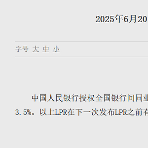 中国人民银行授权全国银行间同业拆借中心公布,2025年6月20日贷款市场报价利率(LPR)为:1年期LPR为3.0%,5年期以上LPR为3.5%。