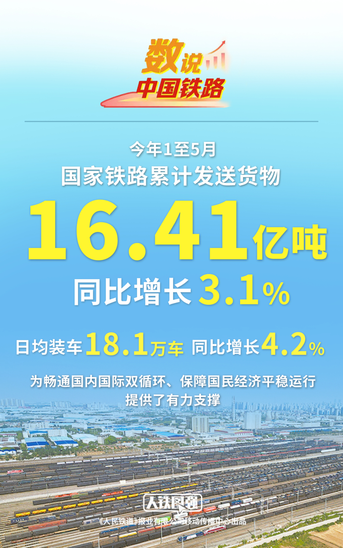 中国铁路:1-5月国家铁路累计发送货物16.41亿吨 同比增长3.1%