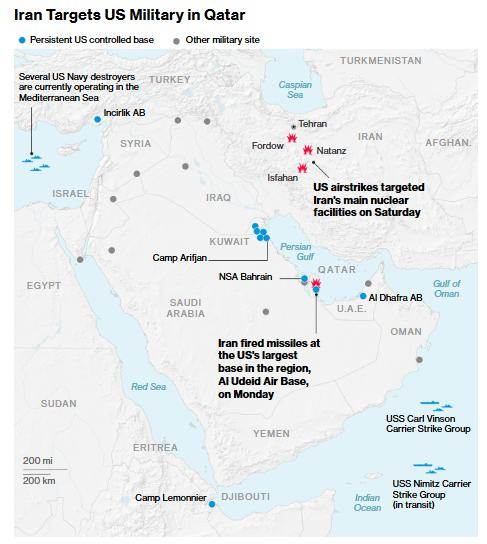 随后,特朗普宣布停火协议的几个小时前,伊朗向位于卡塔尔的美国空军基地发射了导弹,但未造成人员伤亡,以报复美国周末对伊朗地下核设施投掷了 3 万磅的钻地炸弹。据知情人士透露,伊朗的这一举动事先已有所预兆——卡塔尔和美国均得到了事先通知——并且此次事件没有造成人员伤亡,旨在避免与美国进一步升级冲突。