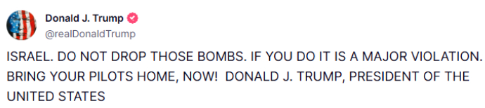 特朗普在社交媒体命令以色列停止投掷炸弹:“以色列,不要投那些炸弹。如果你这么做,那就是严重违反协议,把你们的飞行员带回家,现在就带回去!”