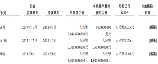 其中,在2018年1月完成A轮融资1亿美元的融资,每股成本为30.75元,交易前估值为96.42亿元;2018年3月完成A1轮融资,募资3.5亿元,每股成本为30.76元,交易前估值为103亿元;2021年8月完成18亿元融资,每股成本为37.6元,投前估值为170亿元。