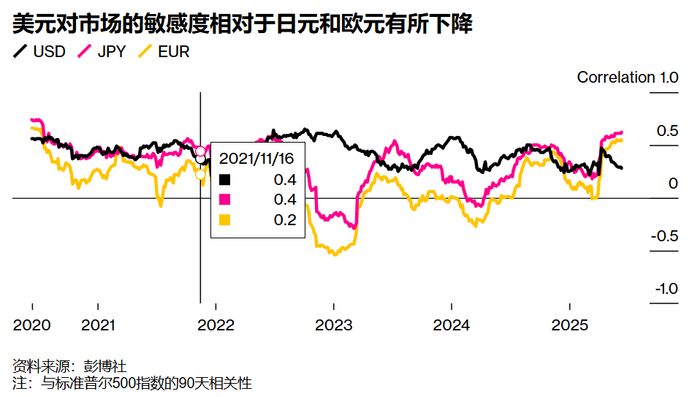 值得关注的是,美元汇率波动与风险情绪指标的相关性出现结构性变化。监测显示,美元对上述六种新兴市场货币与标普500指数的90日滚动相关性指标大幅走低,而欧元、日元与该指数的关联度却攀升至五年高位。这种分化恰逢标普500指数突破4月关税风波阴影再创历史新高,叠加日本央行退出负利率政策及8月日元套利交易大规模平仓的影响,使得欧元和日元更容易受市场情绪波动牵制。