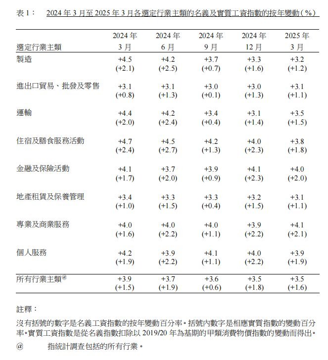 薪金总额统计方面,在统计调查中包括的所有行业主类,2025年第一季度的就业人士名义平均薪金指数较上年同期上升3.2%。扣除以综合消费物价指数计算的消费物价变动的因素后,2025年第一季度的就业人士实质平均薪金较上年同期上升1.6%。
