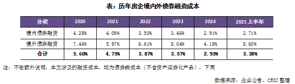 从企业的债券类融资成本来看,2025年上半年的境外债券融资成本为8.60%。2025年2月绿城中国发行了一笔2028年到期的3.5亿美元的优先票据,利息高达8.45%;而6月新城发展发行3亿美元境外债,利率高达11.88%。目前仅极少数房企有在境外发行债券的情况,发行利率均相对较高,主要还是为了借新还旧。