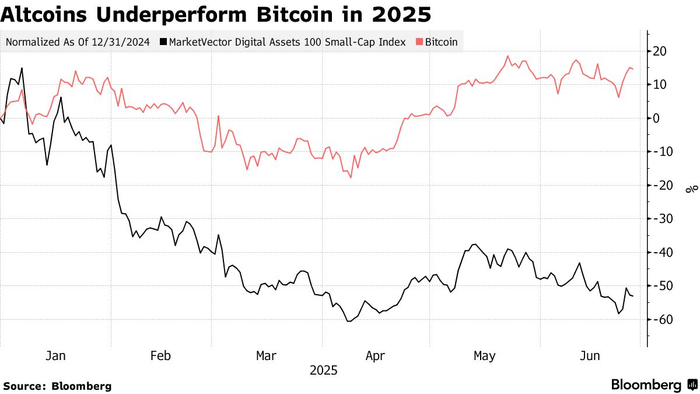 与此形成鲜明对比的是,山寨币正在衰落。一个追踪市值前100名数字资产中后半部分的MarketVector指数,在特朗普于2024年11月5日赢得大选后曾上涨了一倍多,但随后全数回吐涨幅,2025年至今已下跌约50%。