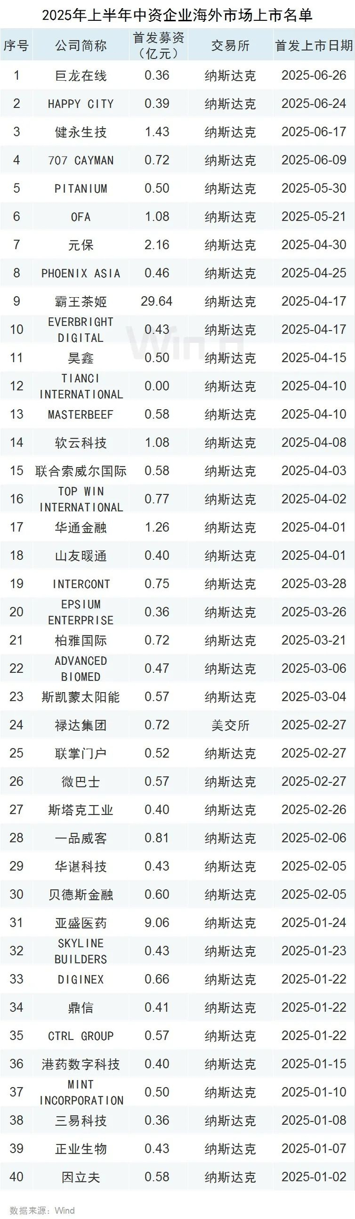 2025年上半年,中资企业在海外IPO均在美股市场完成,1家企业登陆美国证券交易所,其余39家全部在纳斯达克交易所完成上市。