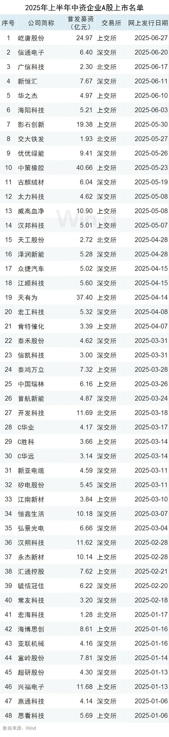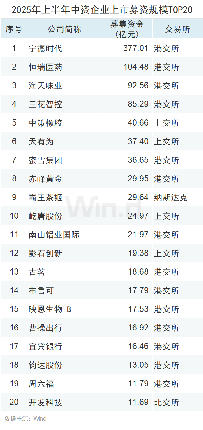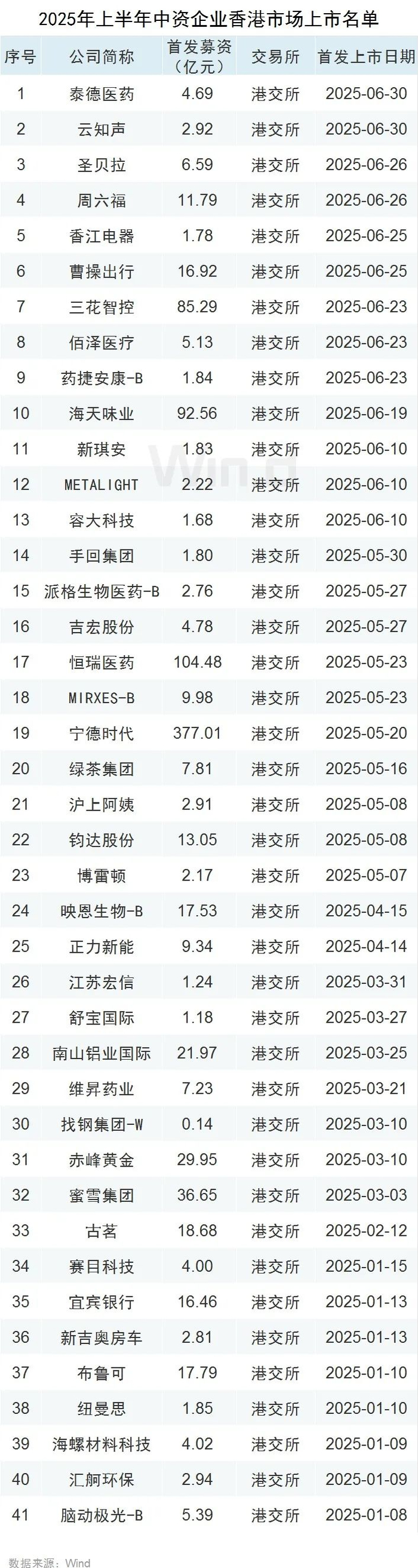 2025年上半年中资企业IPO排行榜出炉 募资金额近1400亿元人民币