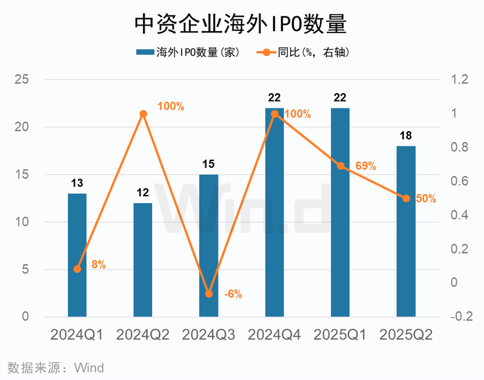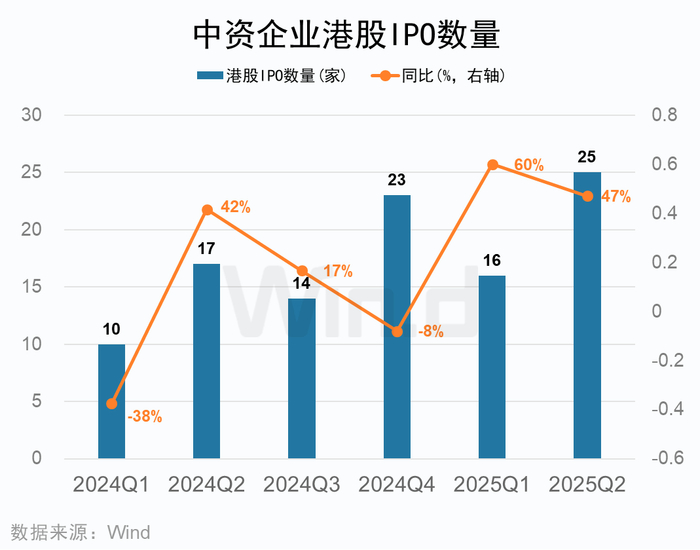 2025年上半年,中资企业上市数量较去年下半年小幅减少,但募资金额接近1400亿元人民币,增长显著。值得注意的是,港股市场已经成为中资企业IPO主要融资渠道。