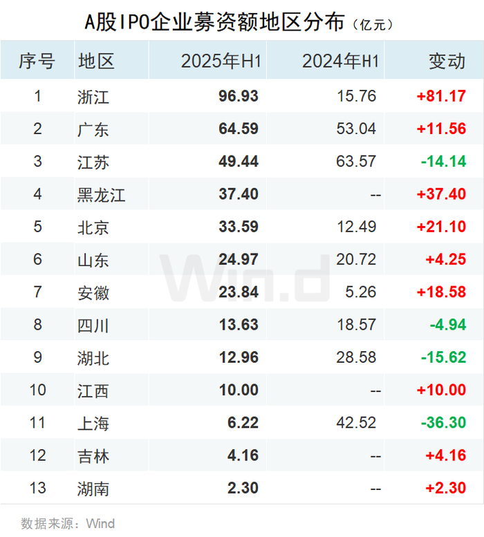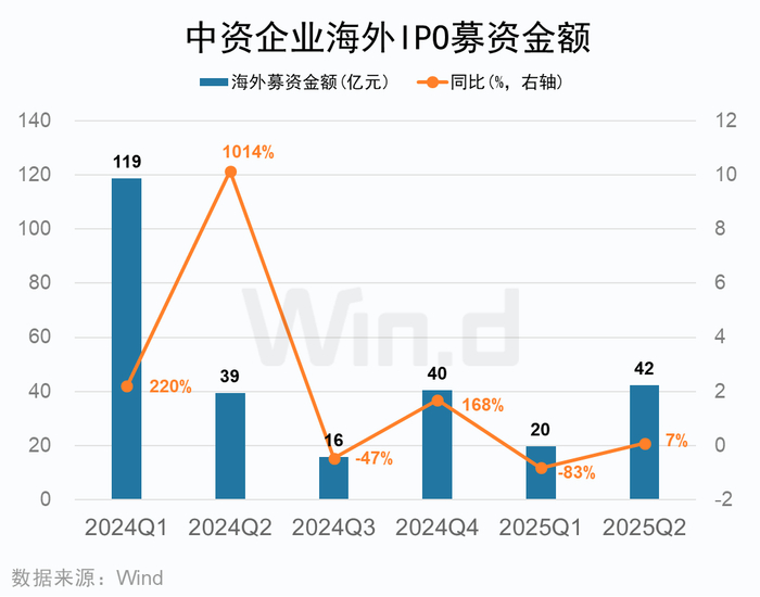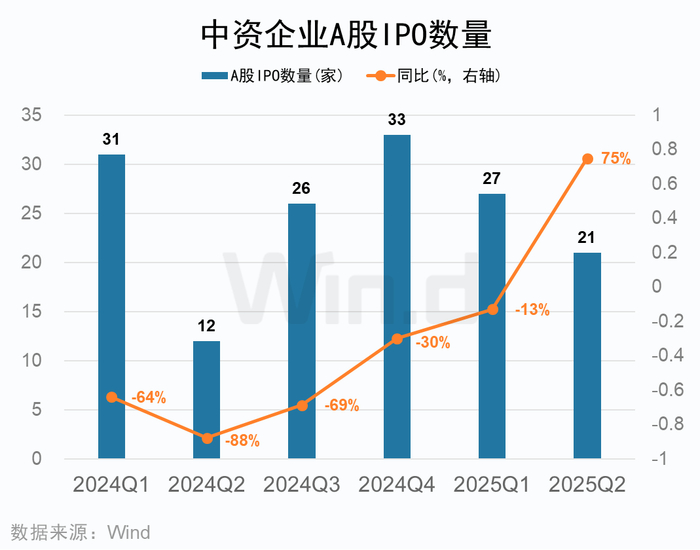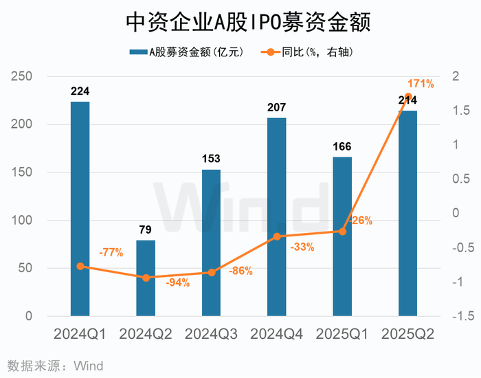 2025年上半年,中资企业A股IPO募资额380.02亿元,其中一季度同比下滑25.87%,二季度同比上升170.98%。