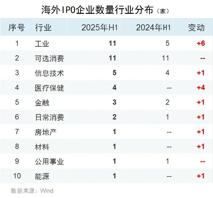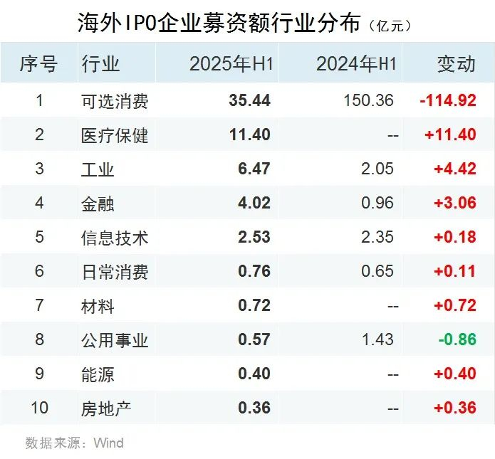 从海外上市的中资企业行业分布看,可选消费企业居多,达11家;募资最多也是可选消费企业,合计为35.44亿元。
