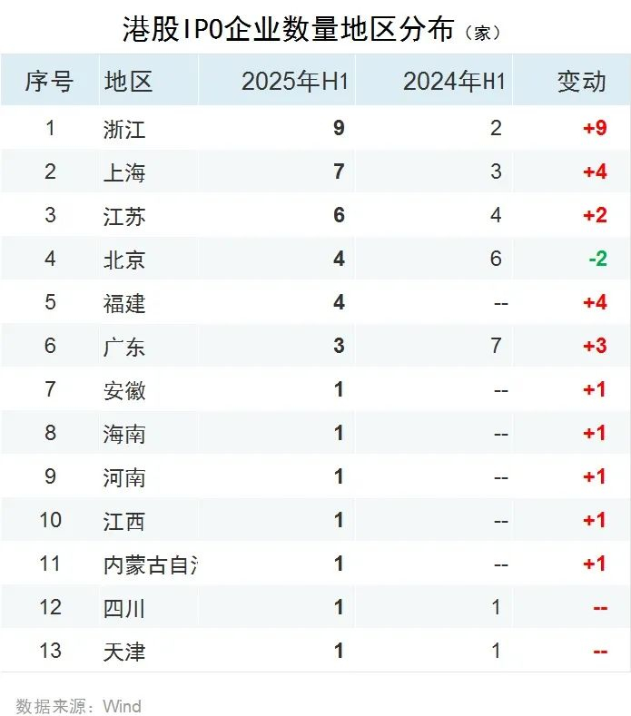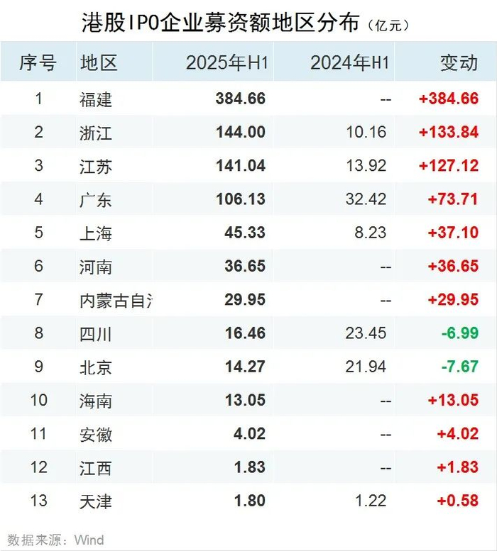 港股市场上市企业,浙江、上海居多,分别为9家、7家。募集资金方面,福建企业募资合计384.66亿元,居首位。