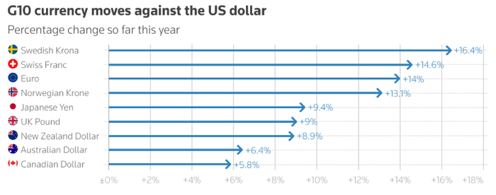 2025 年年初,市场预期日本会迅速提高利率,而美联储则会在今年晚些时候开始降低利率。当特朗普在 4 月实施大规模贸易关税举措时,市场受到冲击,投资者对美元的信心受到动摇,日元汇率从接近 160 的水平迅速上涨了 9%,这是自 2016 年以来日元上半年表现最强劲的一次。