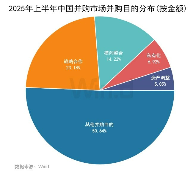从各参与方的并购目的分布来看,战略合作类的并购事件以1,852亿元规模占到总体交易规模的23.18%,横向整合和私有化分别以1,136亿元和553亿元占到总体交易规模的14.22%和6.92%。