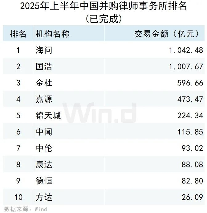 从律师事务所参与并购的规模来看,按照事件首次公告日在2025年上半年的口径统计,国枫律师事务所以565.77亿元的交易规模排名第一;嘉源律师事务所189.70亿元的交易规模位列第二名;中闻律师事务所以115.89亿元的交易规模位列第三名。