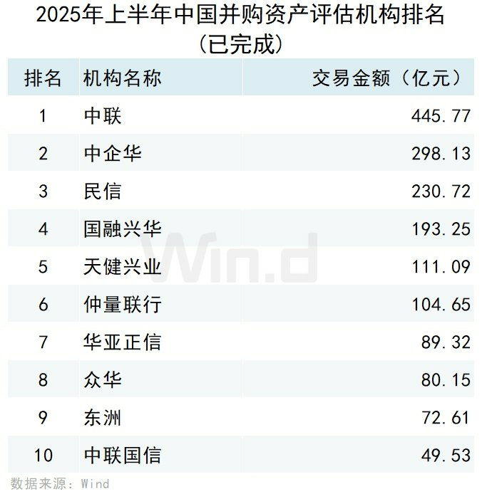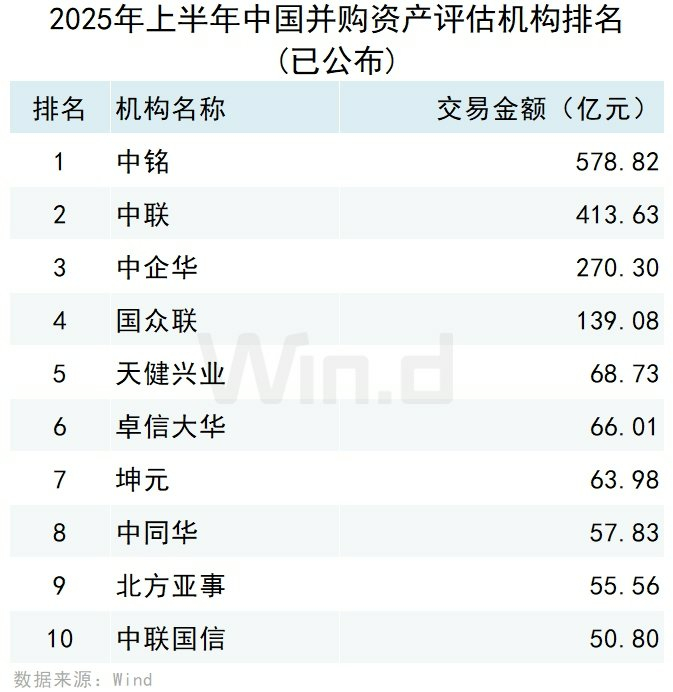 从资产评估机构参与并购事件的规模来看,按首次公告日在2025年上半年的口径统计,中铭资产评估以578.82亿元的交易规模排名第一,中联资产评估和中企华资产评估分别以413.63亿元和270.30亿元的交易规模位列第二名和第三名。