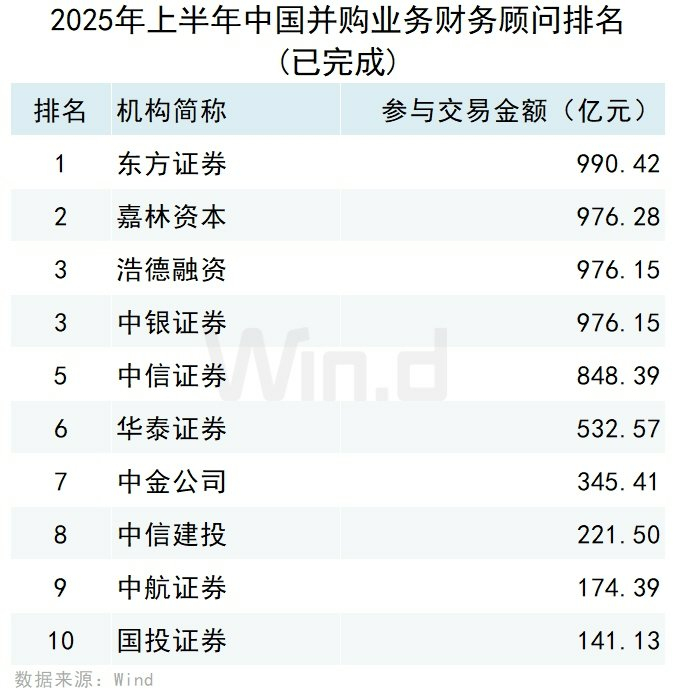 按照并购事件完成日口径统计,排名第一的是东方证券,交易规模为990.42亿元;排名第二的是嘉林资本,交易规模为976.28亿元;并列排名第三的是浩德融资和中银证券,交易规模为976.15亿元。