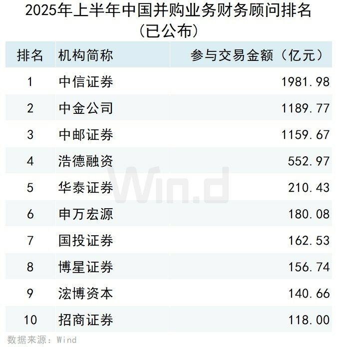 以财务顾问或者独立财务顾问身份参与并购事件的规模来看,按照事件首次公告日在2025年上半年的口径统计,排名第一的是中信证券,交易规模为1,981.98亿元;排名第二的是中金公司,交易规模为1,189.77亿元;排名第三的是中邮证券,交易规模为1,159.67亿元。