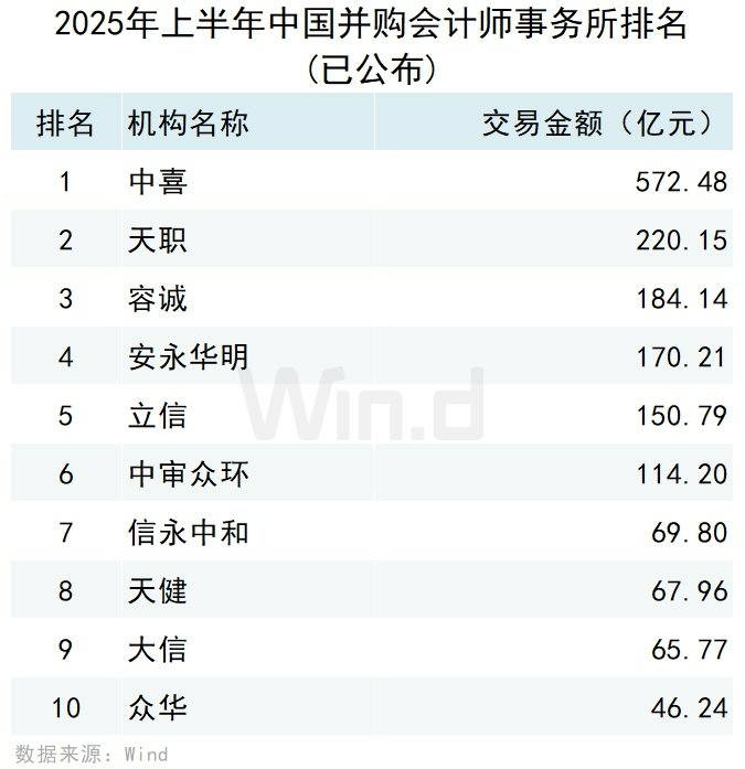 从会计师事务所参与并购事件的规模来看,按照事件首次公告日在2025年上半年的口径统计,排名第一的是中喜会计师事务所,交易规模为572.48亿元;排名第二的是天职会计师事务所,交易规模为220.15亿元;排名第三的是容诚会计师事务所,交易规模为184.14亿元。