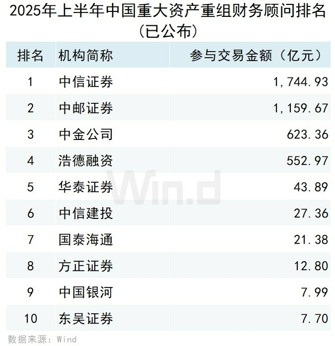 从机构担任财务顾问或者独立财务顾问参与的重大资产重组事件规模来看,按照事件首次公告日在2025年上半年的口径统计,排名第一的是中信证券,交易规模为1,744.93亿元;排名第二的是中邮证券,交易规模为1,159.67亿元;排名第三的是中金公司,交易规模为623.36亿元。