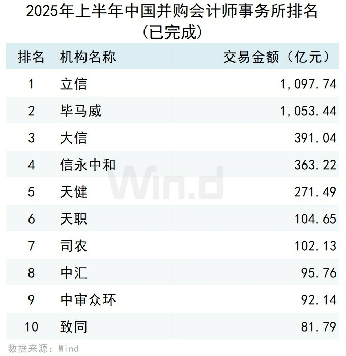 按照并购事件完成日口径统计,排名第一的是立信会计师事务所,交易规模为1,097.74亿元;排名第二的是毕马威华振会计师事务所,交易规模为1,053.44亿元;排名第三的是大信会计师事务所,交易规模为391.04亿元。