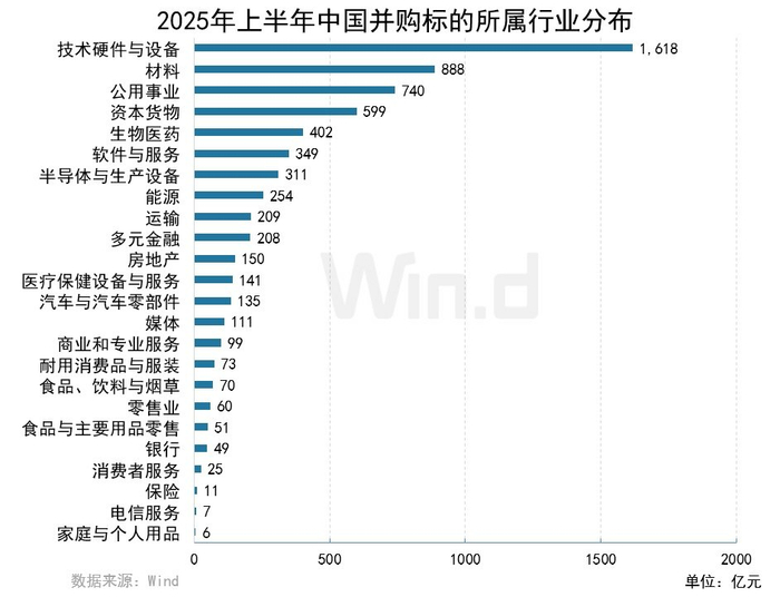 从并购标的方所属的行业分布来看,并购规模排名前三的分别是技术硬件与设备行业,交易规模为1,618亿元,同比上升256.04%;材料行业交易规模为888亿元,同比上升63.97%;公用事业行业交易规模为740亿元,同比上升196.55%。