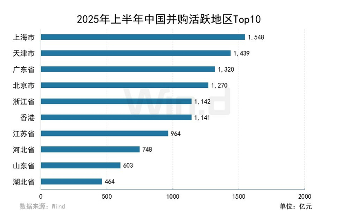 从各参与方所属地区分布来看,2025年上半年中国并购市场活跃的地区排名第一的是上海,并购交易规模为1,548亿元,同比下降35.36%;第二名为天津,交易规模为1,439亿元,同比上升76.95%;第三名为广东,交易规模为1,320亿元,同比下降41.56%。