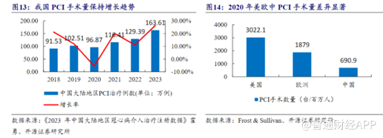 PCI手术渗透率方面,根据 Frost & Sullivan 的统计,2020年我国PCI的手术渗透率为690.9台/百万人,相比之下,美国的渗透率为3022.1台/百万人,差距明显。2024年3月30日,在第二十七届全国介入心脏病学论坛暨第十三届中国胸痛中心大会上公布了 2023 年中国大陆冠心病介入治疗的注册数据。数据显示,2023年冠心病介入治疗的注册总病例数为163.61万例,PCI 病例数的2023年增长率达到了26.44%。