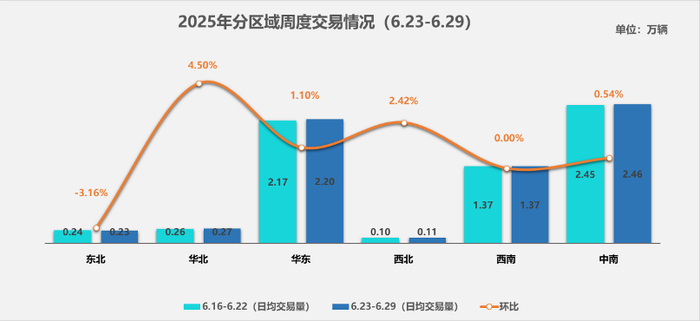本周,二手车市场日均交易量延续小幅攀升态势,市场需求稳步回暖。从区域交易情况来看,除东北、西南地区外,其余各地区交易量均实现不同程度增长。其中,华北地区交易量增速尤为突出。
