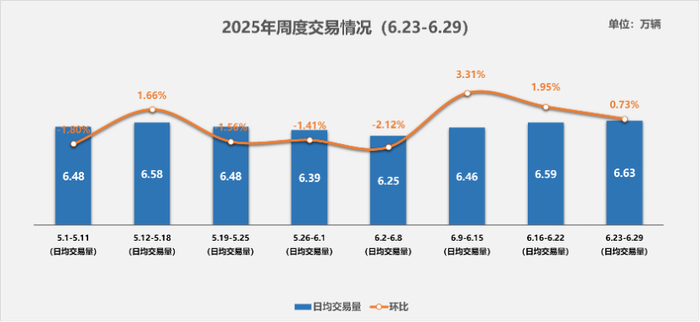 中国汽车流通协会数据显示,2025年6月23日至29日,全国二手车市场延续稳健增长态势,日均交易量达6.63万辆,环比增长0.73%,较上月同期提升2.4%,实现连续三周环比正增长,市场复苏动能持续增强。预计6月全月交易规模约157万辆,市场整体仍处于波动调整阶段。